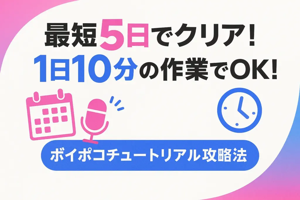 ボイスポコチャを始めたけど、チュートリアルが面倒… チュートリアルを最短で終わらせる方法が知りたい! ボイスポコチャのチュートリアルは、1日10分程度の作業で、最短5日でクリア可能です。 本記事では、「ボイスポコチャのチュートリアルを最短で終わ... -