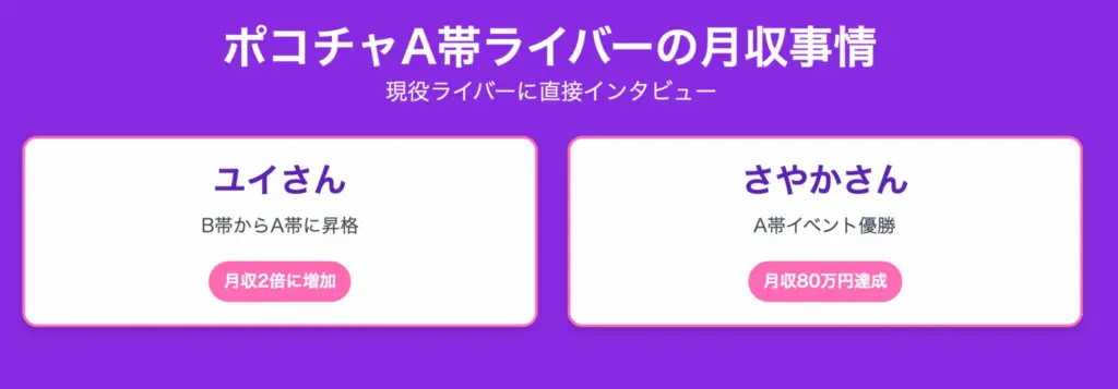 この二つの報酬でポコチャライバーの報酬は計算され、A帯ライバーの平均月収は、約50万円です。