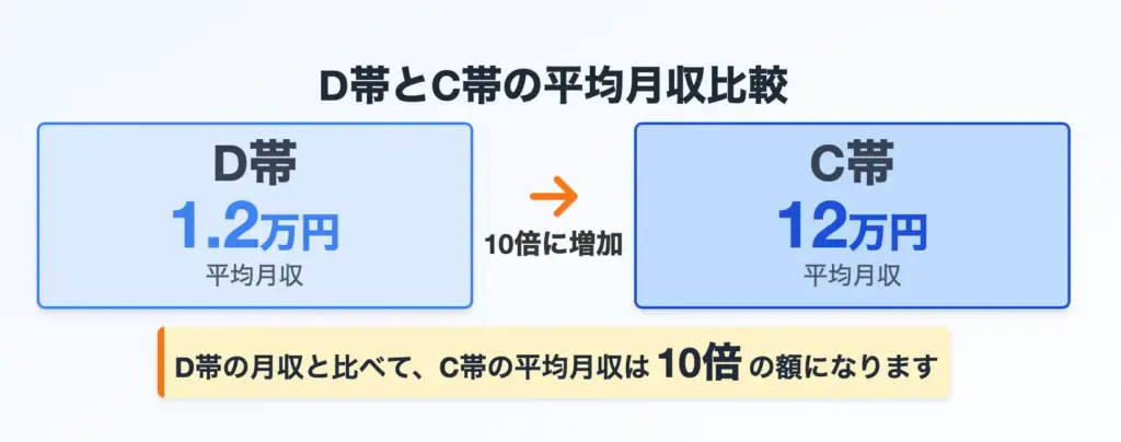 D帯の月収と比べて、C帯の平均月収は10倍の額になります。
