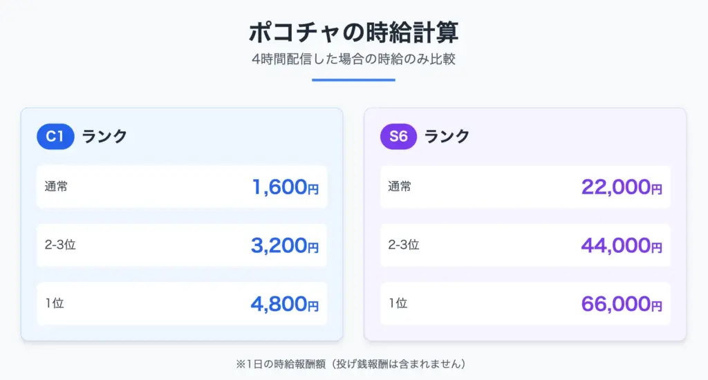 また、各ランクで1日の投げ銭ランキング1位に入るとその日の時給が3倍、2位〜3位に入ると時給が2倍にアップする仕組みです。