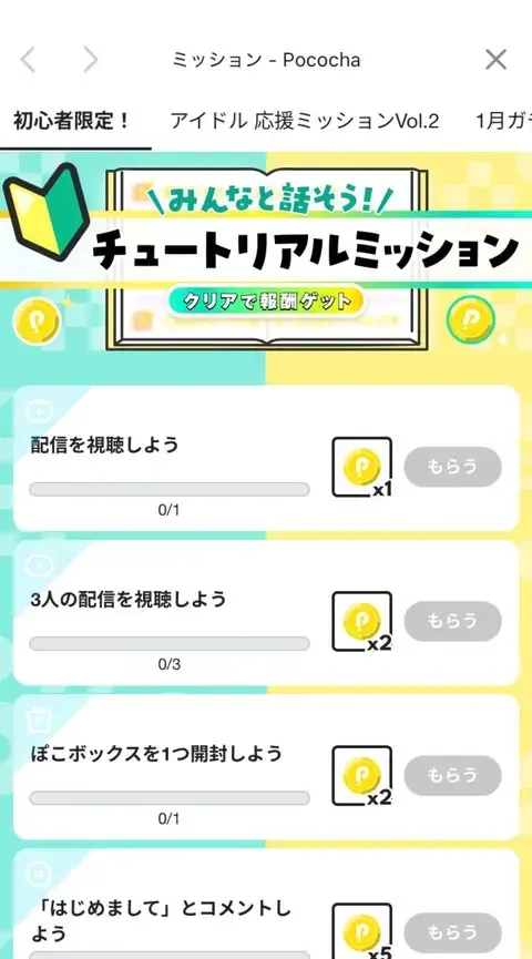 まず、ポコチャの全チュートリアルミッションを確認しましょう。