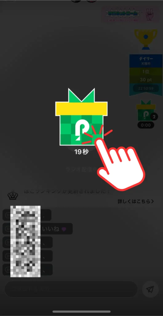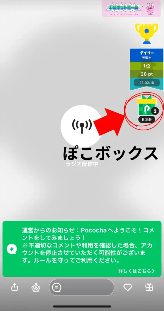 ぽこボックスは、配信枠でリスナーがコメントを送信することで開けることができます。