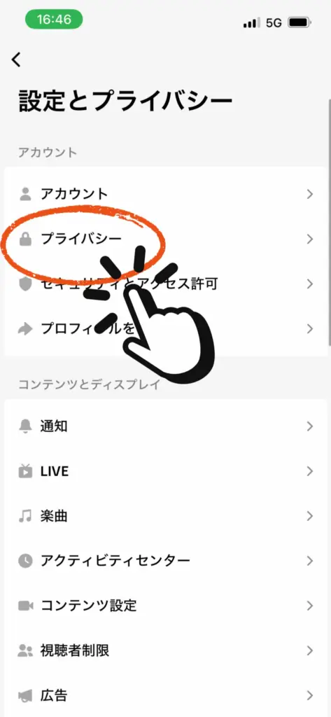 次に画面上部にある「プライバシー」を選択してください。