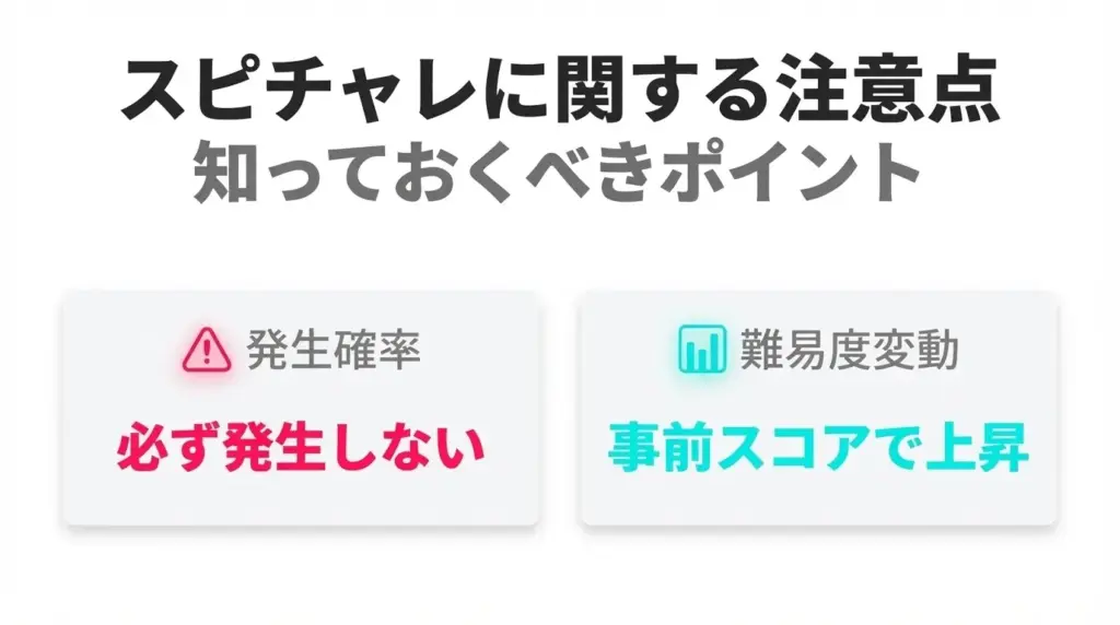 ただし、スピチャレは必ず発生するわけではなく(発生率80〜90%程度)、開始前にスコアを伸ばしすぎるとミッション難易度が上がるため、発生を待ってから一気に攻める戦略が最も効率的です。