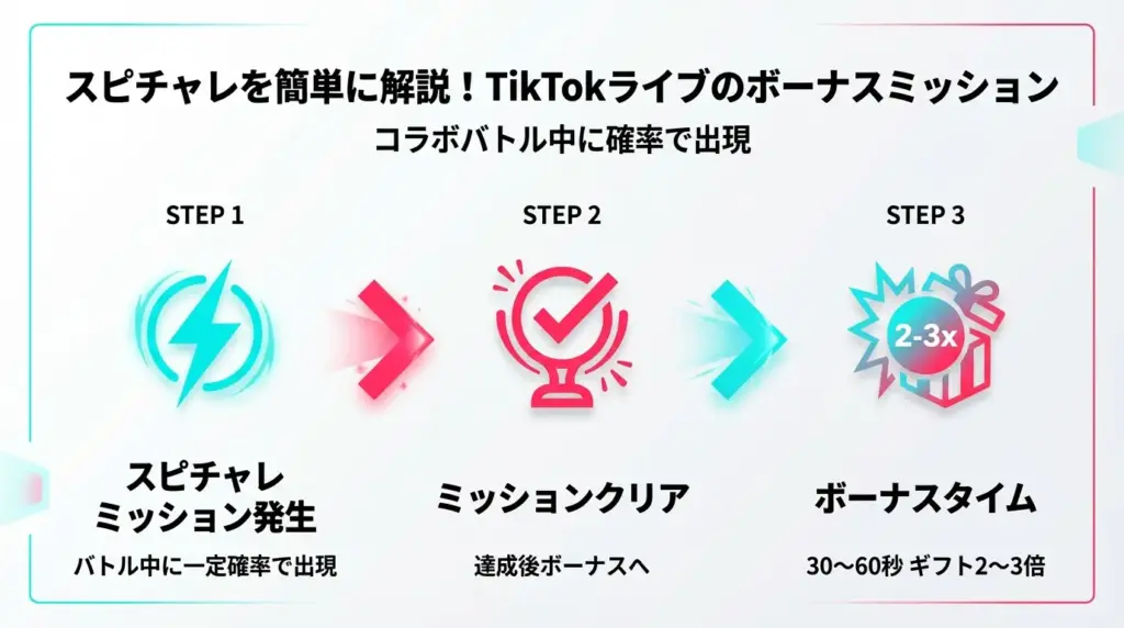 TikTokライブの「スピチャレ」は、バトル中にランダムで発生するボーナスタイムで、ミッションクリア後の30〜60秒間、ギフトポイントが通常の2〜3倍になる重要なシステムです。