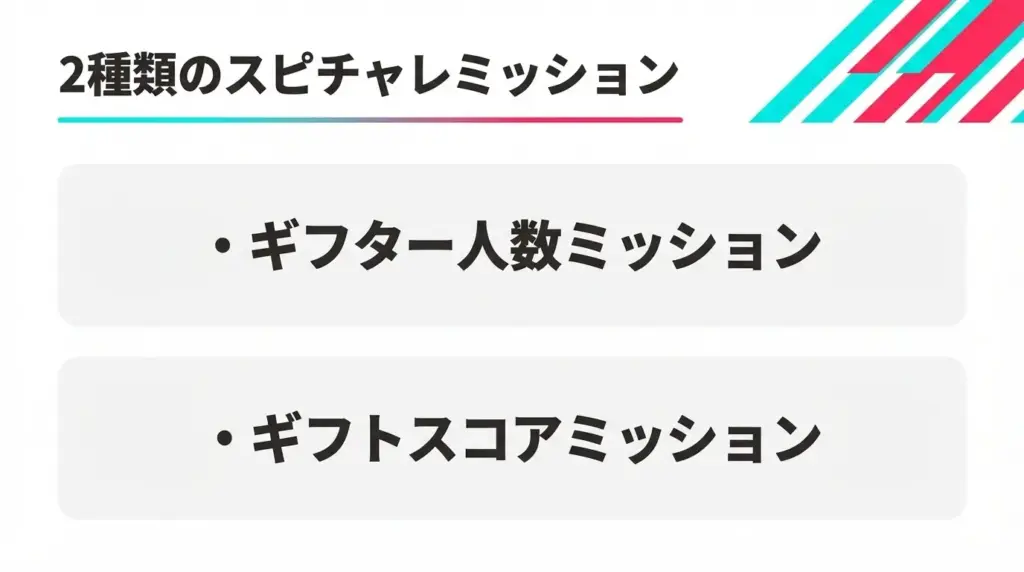 その際の、スピチャレのミッションにはいくつかの形式があり、主に以下の二つのパターンが代表的です。
