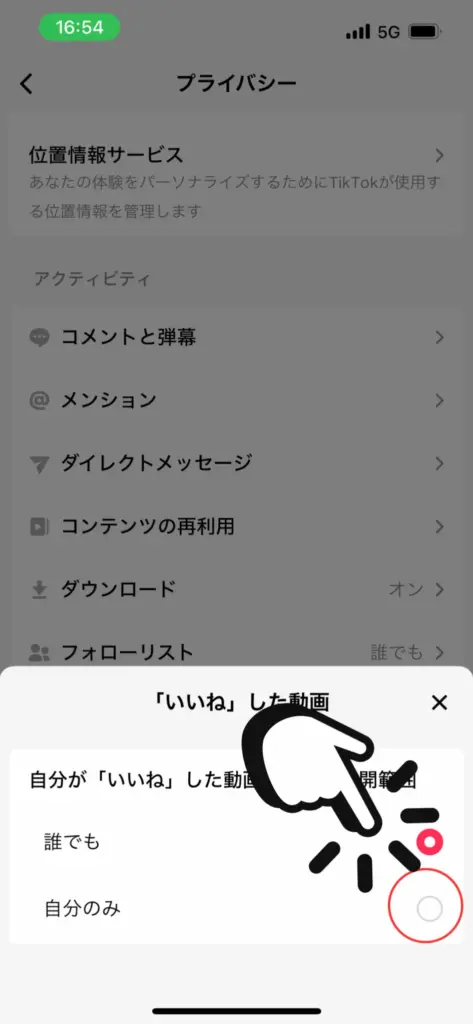 最後に「自分のみ」を選択すると、「いいねした動画」が非公開に設定されます。