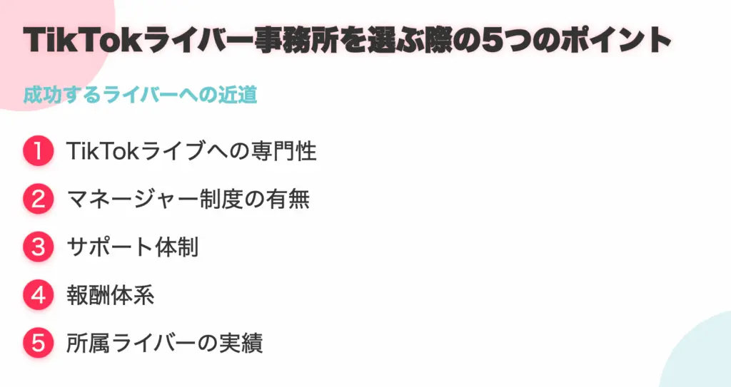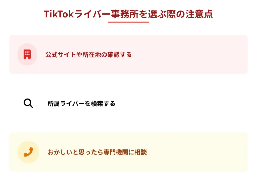 TikTokライバー事務所を選ぶ際にはいくつかの注意点があります。