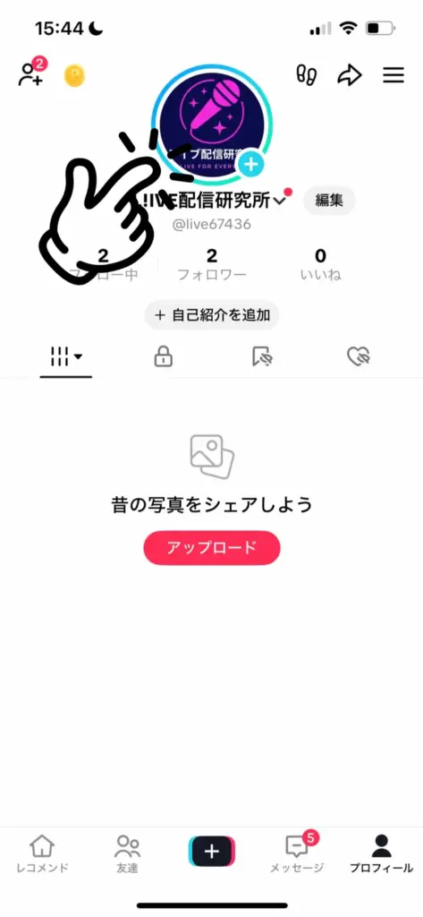 TikTokアプリを開き、「プロフィール」から画面上部のアイコンをタップします。