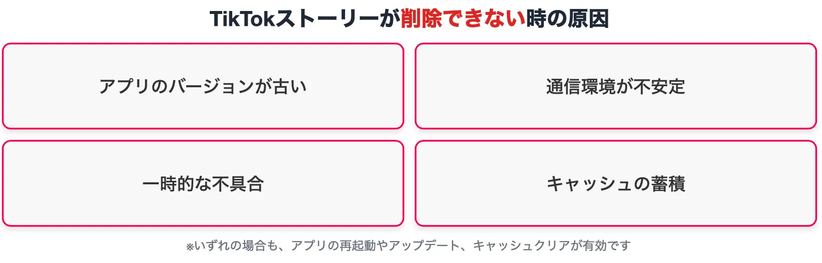 ここでは、TikTokのストーリーが上記の方法で消せない場合の原因と対処法を解説します。