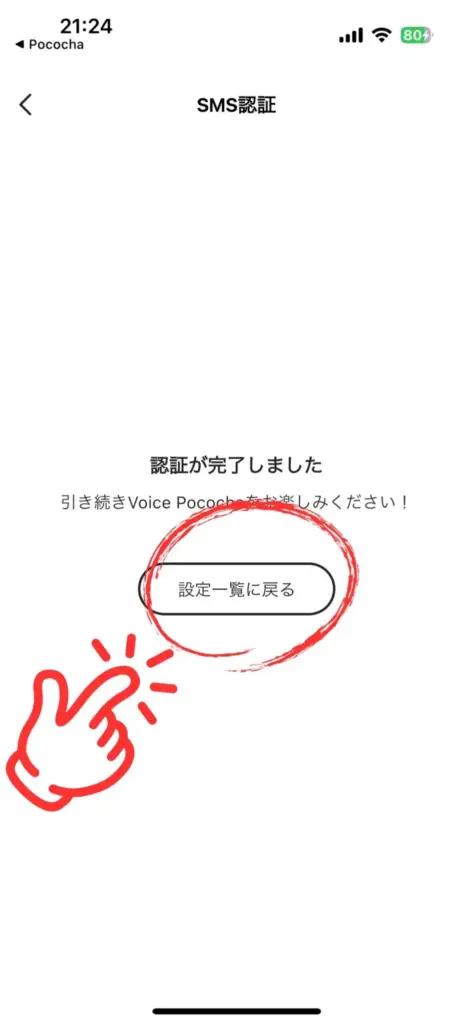 SMS認証後以下の画面に移るので、「設定一覧に戻る」をタップしてください。